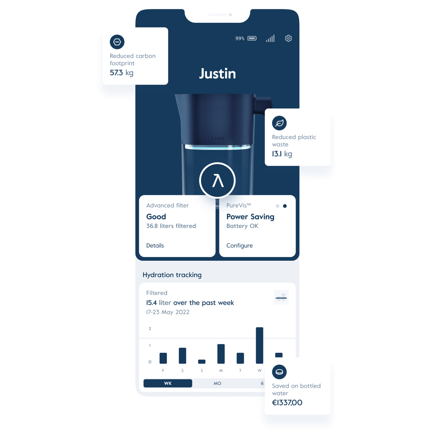 Jedan LARQ filter zamjenjuje više od 450 standardnih jednokratnih boca. Bolje za planet i vaš novčanik.